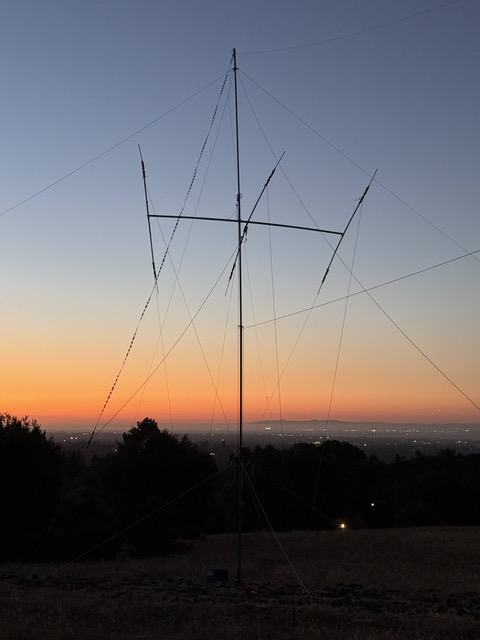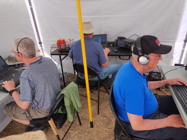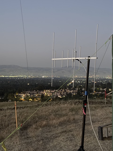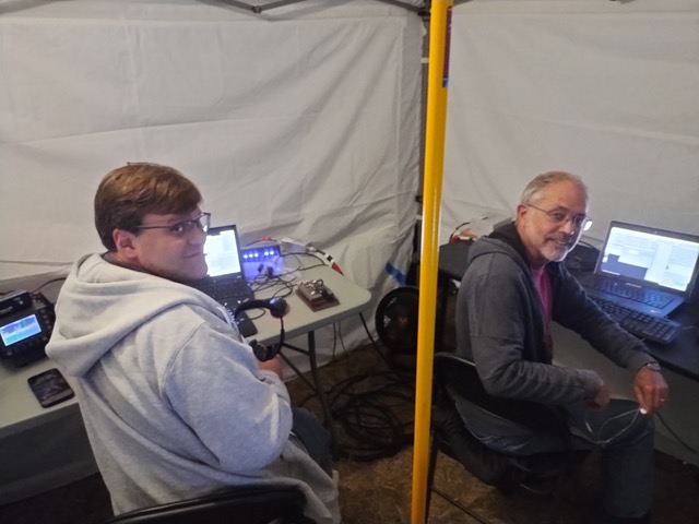 Changes in 2025:  Back in 2023 and 2024, our Mora Hill operation was 12 Alpha Battery: three CW, three SSB, three digital and three VHF/UHF stations along with a “free” GOTA, satellite, and VHF station. Setting up all those stations and associated antennas was a real project. This year we worked to simplify the set-up process and reduce the amount of work required. Part of this change was scaling back to the 7 Alpha Battery category with three CW, two SSB and two digital stations plus the usual free VHF and satellite stations. In terms of HF antennas, we still had WVARA’s 4-band yagi on the club’s 45-foot tower trailer, but instead of last year’s three 2-element quads for 10, 15 and 20 meters, we opted for a 10/15/20 tribander up 30-foot on a push-up mast. This went up in half the time of last year’s quads. And Bobby’s van with its suite of antennas for the digital stations also went up quickly thanks to Dave Koberstien (N9DK). Installation of all of our site’s antennas and stations was completed by mid-afternoon!