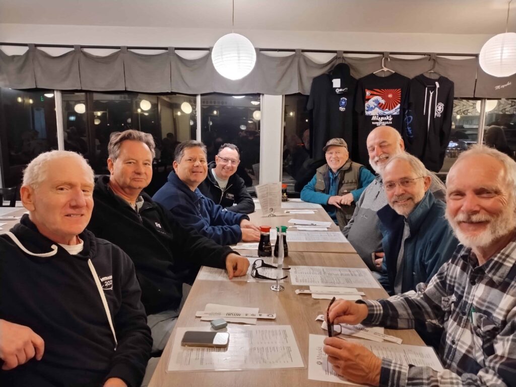 In contrast to summer Field Day where we often put up wild-n-crazy antennas, the focus at this year’s Winter Field Day site was simple, basic antennas that could be quickly assembled in a true emergency — mostly verticals and end-fed wire antennas. Unlike summer Field Day where the bands are packed throughout the night, action during Winter Field Day dwindled beginning in the late afternoon. (We suspect this was at least partly due to the severe winter weather back east.). As a result, many of us took a break after sunset and went to a local Japanese restaurant for a great dinner and very satisfying conversation.